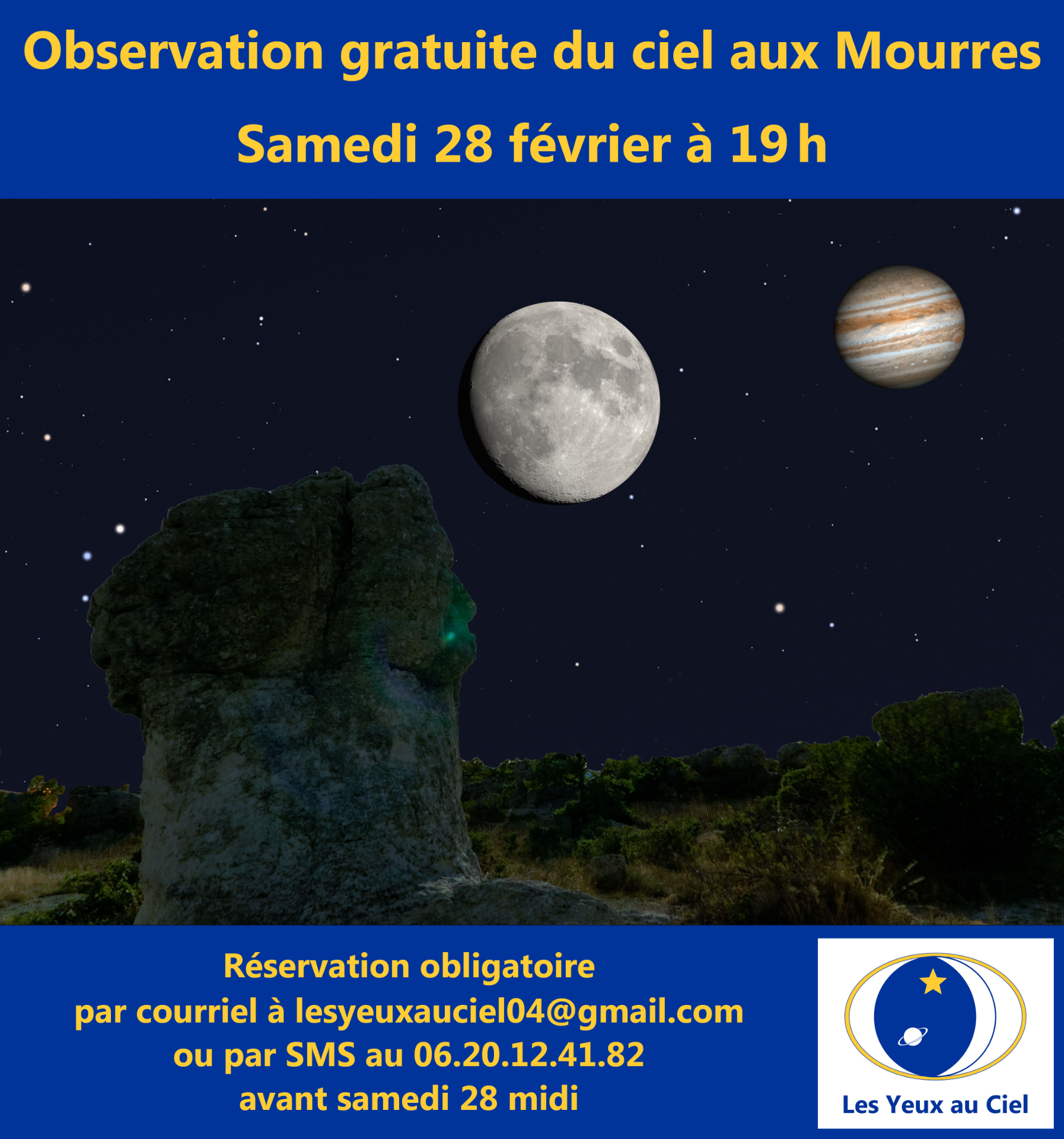 L’association Les Yeux au Ciel vous invite à observer aux instruments (jumelles, télescopes) la Lune et la planète Jupiter et à découvrir l’astrophoto avec divers instruments, notamment des télescopes numériques, sur le site des Mourres, à Forcalquier, le samedi 28 février à 19 h (gratuit). Bien noter que : • il est obligatoire de réserver avant la date limite du samedi 28 février à midi par courrier électronique à lesyeuxauciel04@gmail.com ou par SMS au 06.20.12.41.82 (Alain) ; • les véhicules doivent être garés sur le parking des Mourres et il faut rejoindre à pied le site d’observation, en haut des Mourres, en empruntant la piste qui contourne par la droite les rochers des Mourres ; • il faut prévoir des vêtements très chauds ; • la soirée d’observation peut être annulée en cas de mauvaises conditions météorologiques. Merci de cliquer sur le lien suivant pour prendre connaissance de toutes les consignes à respecter et du plan d’accès au site d’observation : https://drive.google.com/file/d/1ykQrBQji8yzj3rNSirW40WqimyGALb1q/view?usp=sharing Rendez-vous aux Mourres ce samedi 28 février à 19 h !